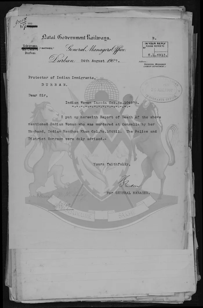 The Natal Government Railways report to the Protector of Indian Immigrants on August 24, 1907, identified the husband of Dayal, 25-year-old Mendhoo Khan, indenture number 104911, as responsible for her murder.