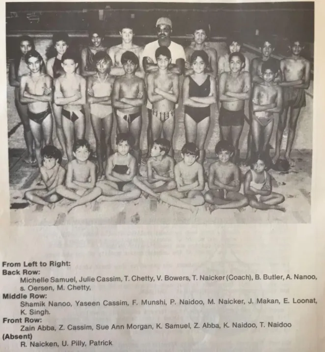 Credit should also go to the founders of the Lenasia Amateur Swimming Academy led by the late Farid Waja, Nazir Essop, Aswin Vallabh, Hansa Morar, Sundra Moodley and Baboo Jairam, which played an instrumental role in promoting swimming locally. Established in 1986, it has quietly promoted the sport in the community.