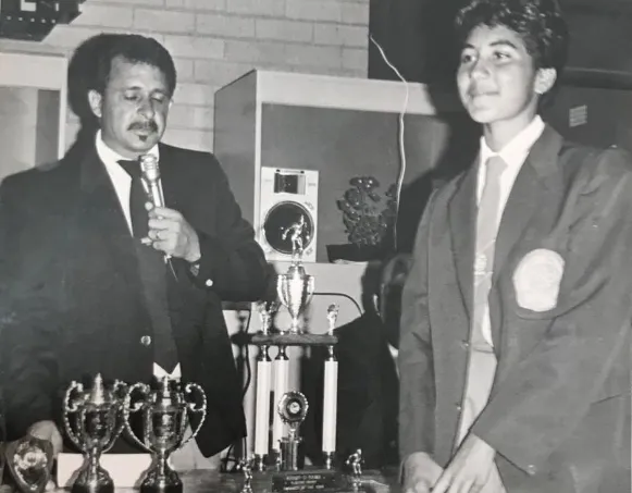 Yusuf “Joe” Cassim – Chairman of Atlantis Swimming Club with a young swimmer.