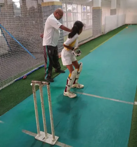 Elvis Govender teaches a young cricketer the ropes during a coaching session