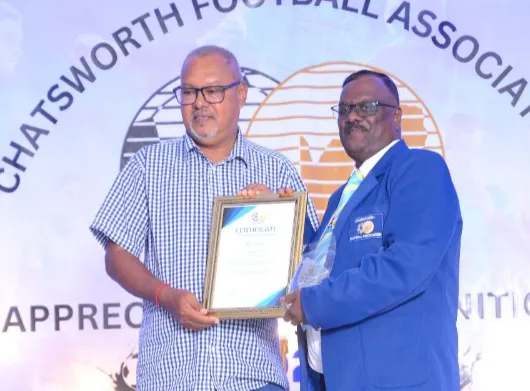 Elvis Govender who also played professional football for Berea FC is seen receiving an award from Chatsworth Football Association executive member Patrick Naidoo in 2024