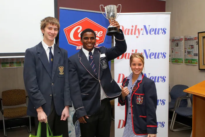 Daily News school sports star of 2012 finalists Trent Bingham of Durban High School, and Heather McEwan of Epworth High School in Pietermaritzburg, congratulate the winner, Kearsney College's Sandile Kubeka, on Wednesday night. The fourth finalist, Clifton College's Senuran Muthusamy, was unable to attend the event. Picture: Terry Haywood Daily News school sports star of 2012 finalists Trent Bingham of Durban High School, and Heather McEwan of Epworth High School in Pietermaritzburg, congratulate the winner, Kearsney College's Sandile Kubeka, on Wednesday night. The fourth finalist, Clifton College's Senuran Muthusamy, was unable to attend the event. Picture: Terry Haywood