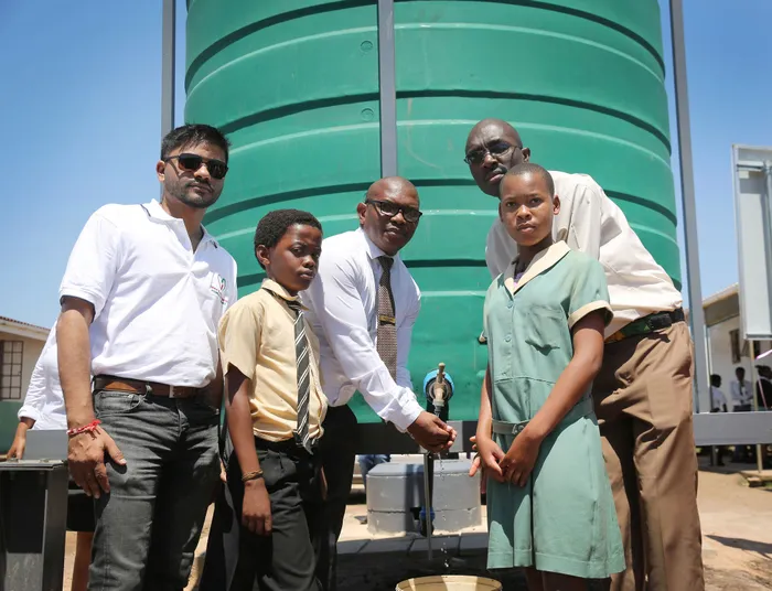 The New River combined school principal Sandile Ncube, councillor Mpilenhle Mkhize, sponsor Vidhor Mangaroo and two pupils, Ndumiso Mhlongo and Thalente Khubisa, enjoy the borehole water that was sponsored by the Ishwar and Laila Mangaroo Foundation Trust, at Mzinyathi, Durban. | Motshwari Mofokeng/African News Agency(ANA)