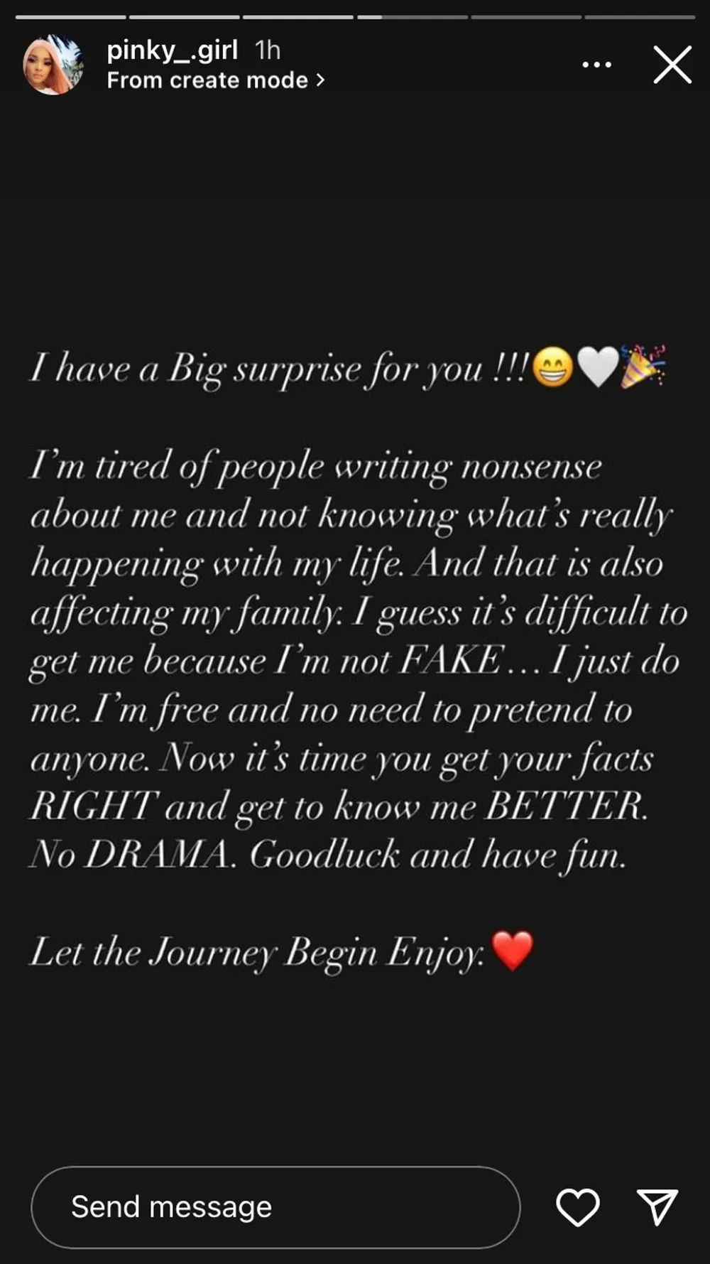 “Let the Journey Begin Enjoy,” wrote Pinky Girl, raising curiosity of whether she was dropping her own reality show.