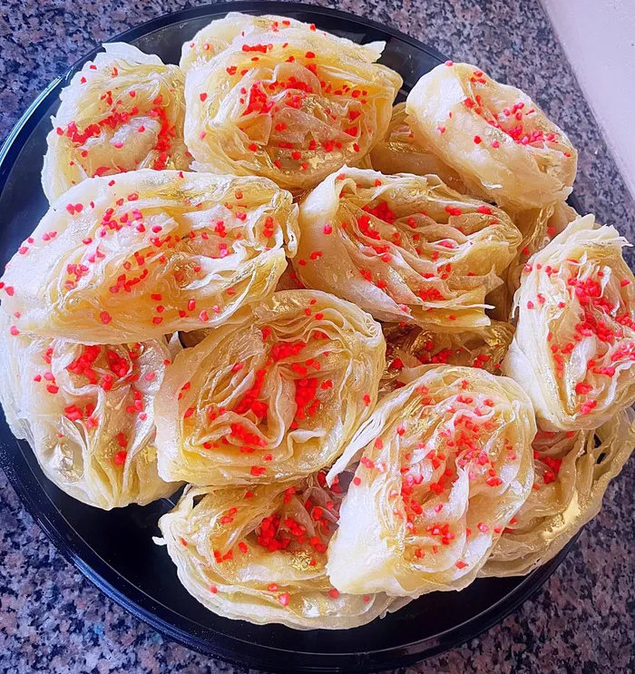 Roll into large rectangular shapes. Cut the edges to make it straight. Cut into 3cm size strips. Fold each strip 5 times. You can use a flour paste to seal it. Press down with rolling pin until it is flat (not very flat).