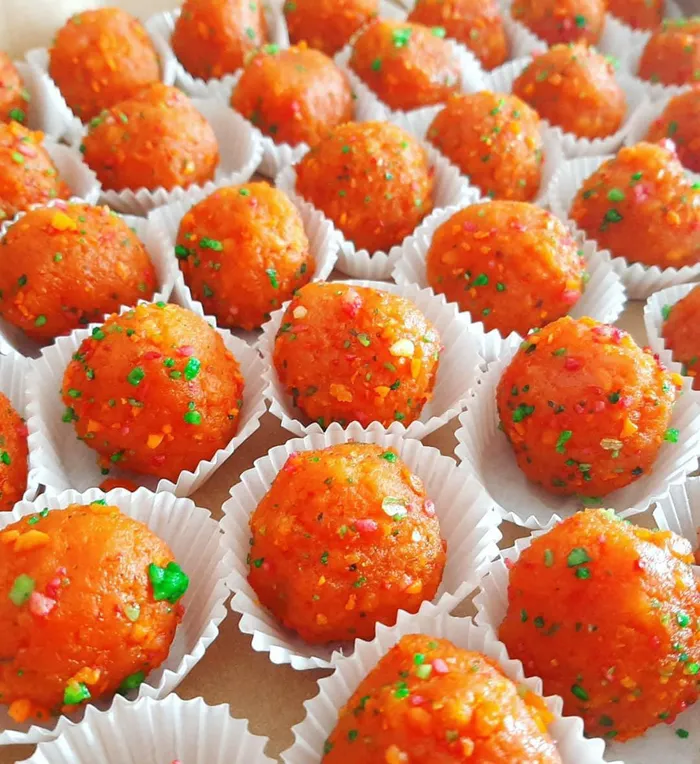 Fry in ghee or oil using a colander or a straining spoon. Fry for a few seconds then remove and place into the warm syrup. Allow to sit for a few hours then, using a fork, break the bhoodi down. This will make it easier to roll. Pinch enough and roll into round balls. Place into foil cups add almonds or gold leaf for décor.