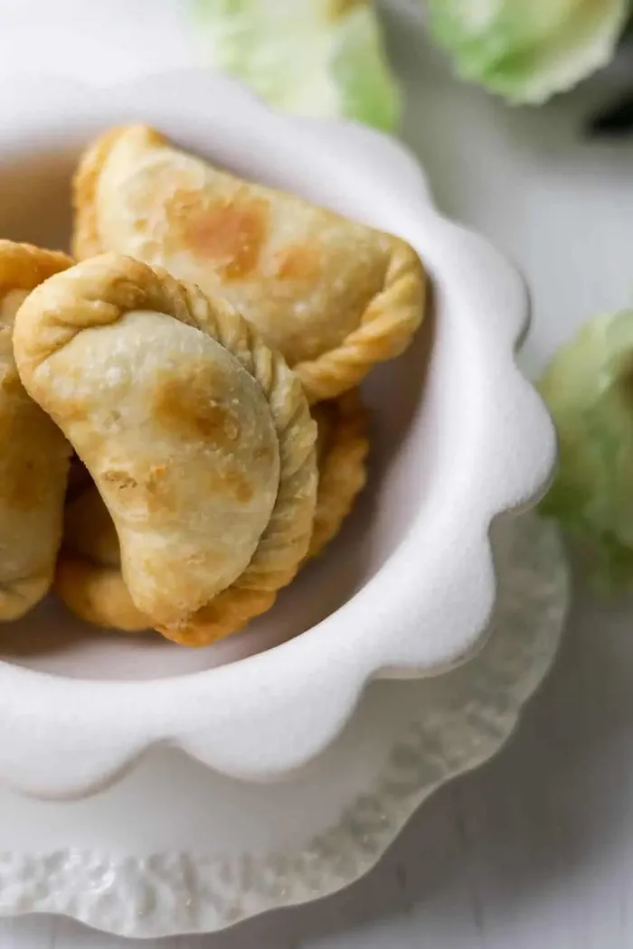 Place a teaspoon of filling onto one side of each circle and fold it over, spread some of the flour paste on the edges of the circle. Bring the edges together and press it down with your fingertips. You can make a rope like design on the edge of the poli or you can press it with a fork. Fry the poli in hot oil over medium heat. Serve warm.