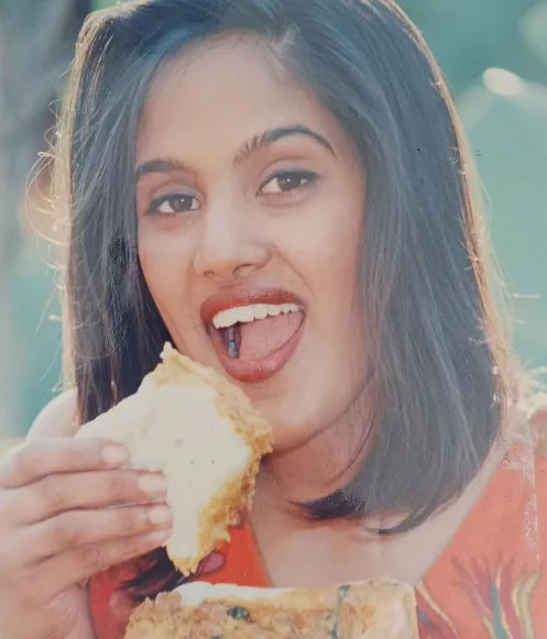 Actress Leeanda Reddy tucks into a Durban bunny chow back in the day when like cookbook author, Madhur Jaffrey, she was a young actress.