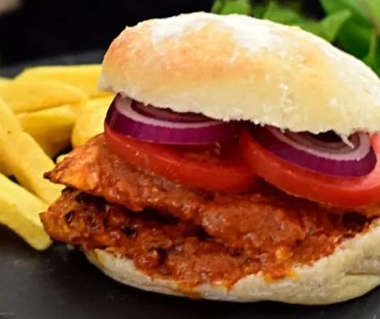 Cut the bread rolls in half. Place the chicken on one half, drizzle more sauce if you wish. Peri-Peri sauce is also great. Place some sliced onion and tomato on top and cover with the other half of the bread roll.
