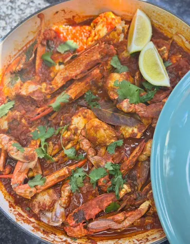 Simmer for 10 to 15 minutes until the crab is fully cooked. Finish with fresh coriander and serve with lemon wedges.