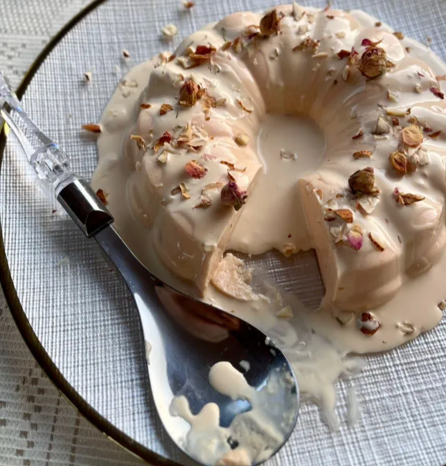 When it starts to boil, remove from the stove. Add the condensed milk, dessert cream, elachi powder and rose water. Pour into the desired mould or dessert cups, and place in the fridge to set.
