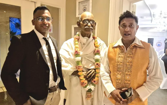Kenthran Govender and Praven Allopi flank a statue of Mahatma Gandhi.