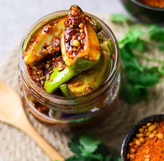 Place the mangoes in a bowl and pour in the vinegar. Heat the vegetable oil in a pan and add the garlic, the pickle masala and spices. Cook for 30 seconds and add the mixture to the mangoes. Mix well and add the syrup.