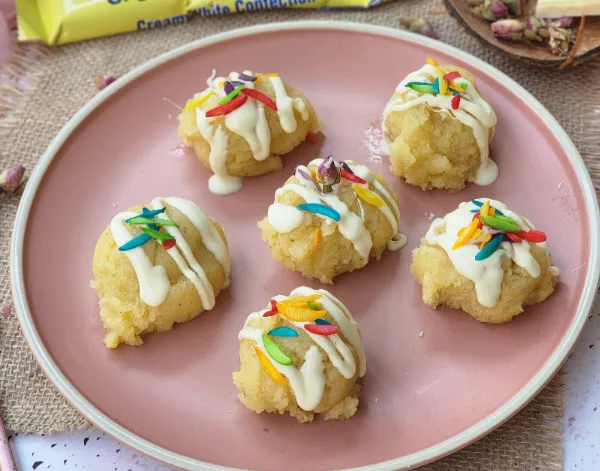 Once the mixture thickens, add the remaining cream and mix well. Garnish with a drizzle of Milky Bar and coloured almonds.