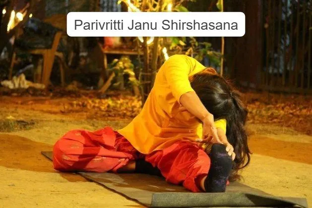 - Parivritti janu shirshasana: sit upright with your legs spread wide. Bend the left knee, placing the heel near the perineum, while keeping the right leg extended sideways. Inhale and raise the left arm, then exhale and stretch it over the head towards the right foot, holding the foot with both hands. Gently bring the head towards the knee and hold the posture while breathing in ujjai. Return slowly and repeat on the other side.