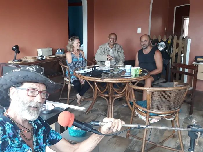 Off the grid and on air, Graham Robjant speaks over the internet to his radio audience, supported by three of his team, from left, Debbie Calitz, Henry Paul and Alex Clarke. Picture: Duncan Guy.