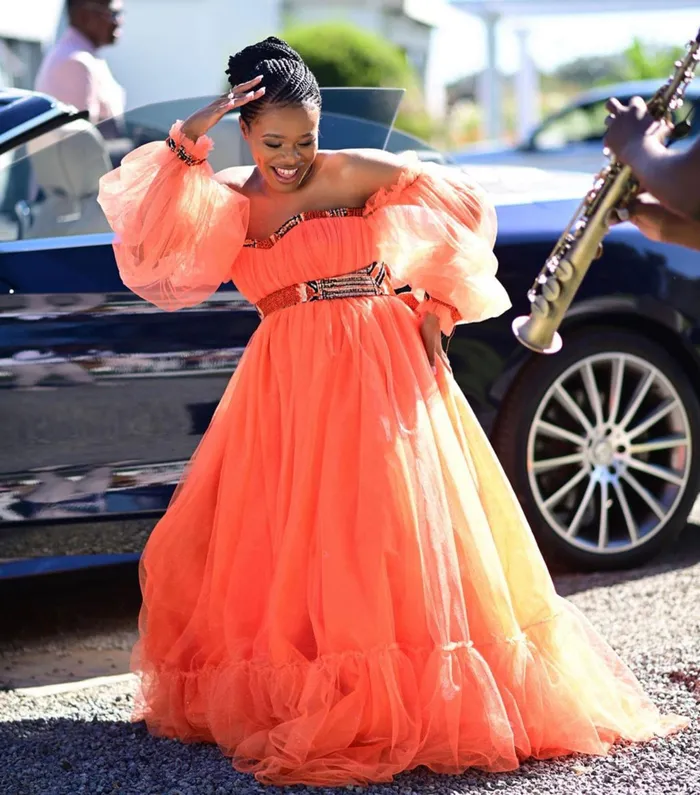 The “Blood and Water” star wore an orange dress by Haute Africa and styled her hair into straight-up cornrows.