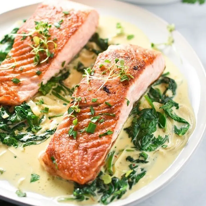Place creamed spinach on the plate and top with crispy salmon (you can remove the skin if you like). Top with parsley.