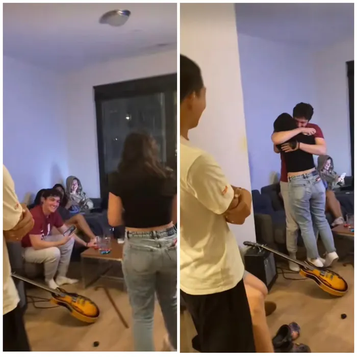 Her boyfriend is seated on a couch with three other girls as Robbie’s guy friends amusedly watch events unfold from a distance. Locking eyes, the couple tentatively inch closer with Zarras extending her arms out for a hug that the internet has since ripped to shreds. One TikTok user by the name of @sizzle took to the comments section to express this saying, “He hugged her like she was his aunt at Christmas.”