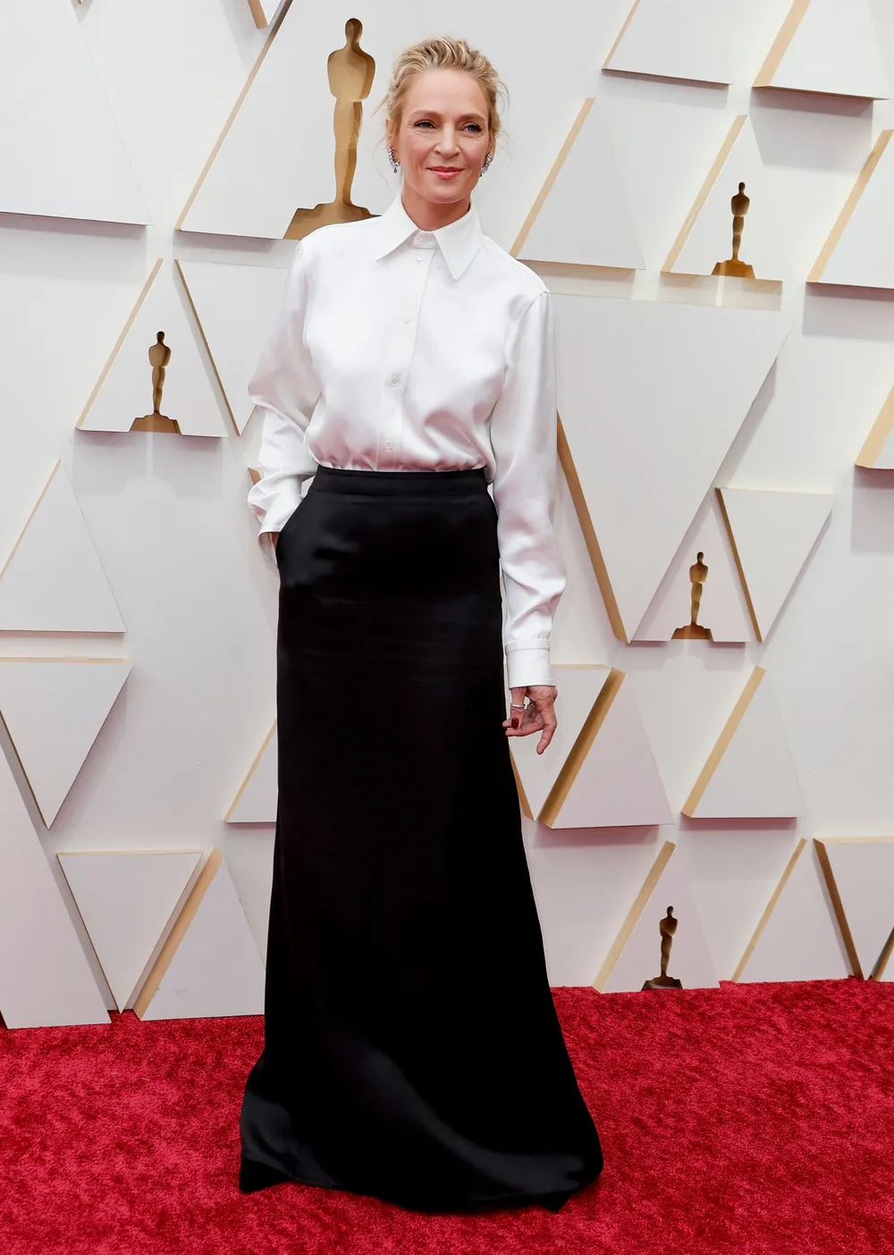 Thurman was statuesque, wearing a white button shirt by Bottega Veneta and a floor length black satin skirt. A simple, yet killer look, one that Thurman easily bodied. The look was in ode to her scene in Pulp Fiction, where she wore a similar white shirt. The film was being honoured at the Oscars this year.