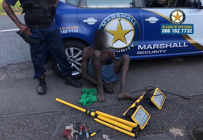 Marshall Security said when the thief spotted an Armed Response Officer, he dropped the stolen goods and began fence hopping from one property to the next in the Glenhills area in Durban North. A suspect who stole from a property in the Glenhills area in Durban North was apprehended by Marshall Security members after an hour-long chase. Picture: Marshall Security.