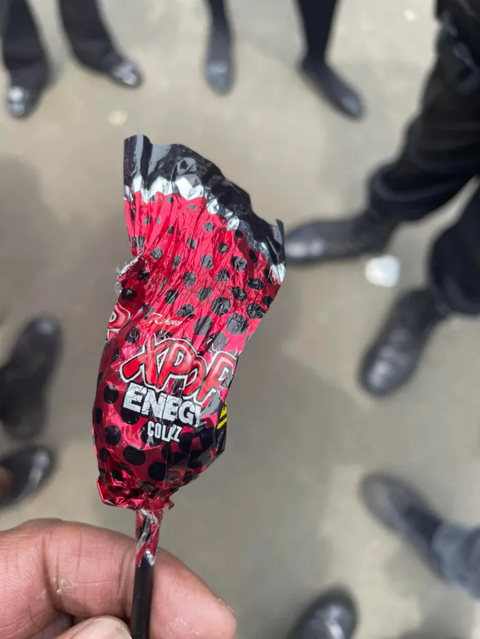 A security officer holds a XPOP Energy Cola Fizz lollipop in his hand. 40 pupils from a Verulam primary school exhibited signs of food poisoning after they allegedly consumed XPOP Energy Cola Fizz lollipops at school. Picture: Reaction Units South Africa (Rusa)