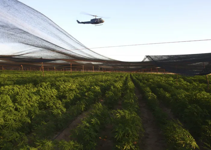 An army helicopter flies over the biggest marijuana plantation found in Mexico, in San Quintin, about 350km away from Tijuana. Mexican soldiers discovered the plantation in a remote desert surrounded by cactuses, a top army officer said on Thursday. An army helicopter flies over the biggest marijuana plantation found in Mexico, in San Quintin, about 350km away from Tijuana. Mexican soldiers discovered the plantation in a remote desert surrounded by cactuses, a top army officer said on Thursday.