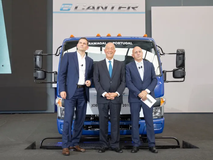 Start of production of the Fuso eCanter at the Tramagal plant, Portugal. From left to right: Marc Llistosella, President & CEO Mitsubishi Fuso Truck and Bus Corporation; Marcelo Rebelo de Sousa, President of the Portuguese Republic; Jorge Rosa, Head of the Tramagal plant Start of production of the Fuso eCanter at the Tramagal plant, Portugal. From left to right: Marc Llistosella, President & CEO Mitsubishi Fuso Truck and Bus Corporation; Marcelo Rebelo de Sousa, President of the Portuguese Republic; Jorge Rosa, Head of the Tramagal plant