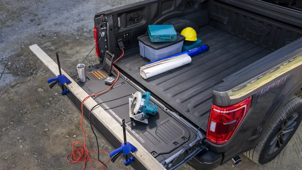 Another handy new feature is the Tailgate Work Surface that includes integrated rulers and clamps for cutting wood, and spaces to stash your phone or tablets upright as well as your pencils and coffee cup.