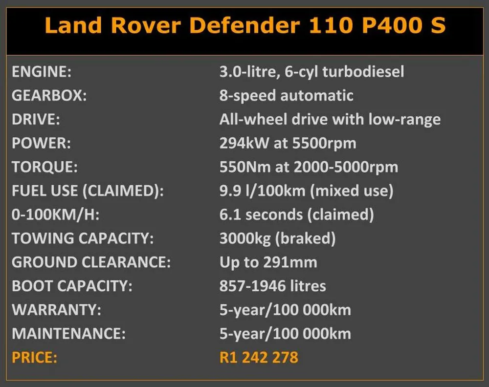Prices start at just over a million rand for a Defender 90 base model, and rise all the way to R1 592 000 for a Defender 110 P400 X.