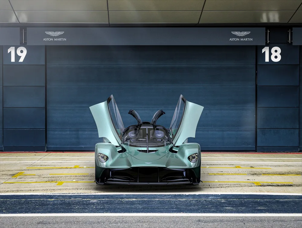 The Valkyrie’s V12 hybrid powertrain remains unaltered, with 850kW and 900Nm on command, but Aston Martin has made alterations to the hypercar’s carbon fibre structure, while also reconfiguring the active aerodynamic and chassis system to ensure that the driving experience remains optimal when the roof is down. To accommodate its open-top format, the regular Valkyrie’s gullwing doors make way for front-hinged units that swing upwards.