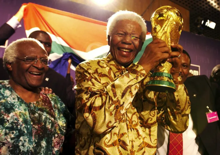 Nelson Mandela, right, holding the World Cup trophy, Archbishop Desmond Tutu, left, and other members of the South African delegation celebrate after it was announced that South Africa will host the 2010 soccer World Cup. Photo: AP/FIFA via Keystone Nelson Mandela, right, holding the World Cup trophy, Archbishop Desmond Tutu, left, and other members of the South African delegation celebrate after it was announced that South Africa will host the 2010 soccer World Cup. Photo: AP/FIFA via Keystone