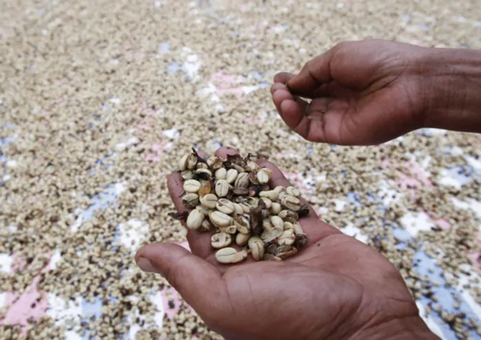 A farmer checks arabica coffee bean while drying them during an early harvest. A farmer checks arabica coffee bean while drying them during an early harvest.