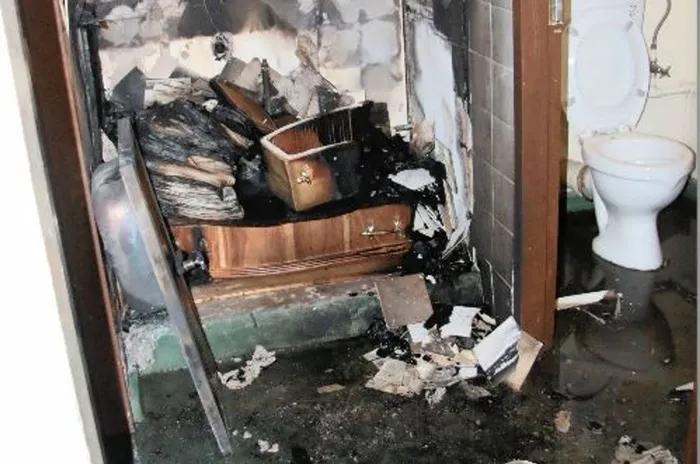 Two tiny coffins were set alight at the mortuary belonging to Kgagalelo Funerals in Community Road. Picture: Soraya Crowie/DFA Two tiny coffins were set alight at the mortuary belonging to Kgagalelo Funerals in Community Road. Picture: Soraya Crowie/DFA