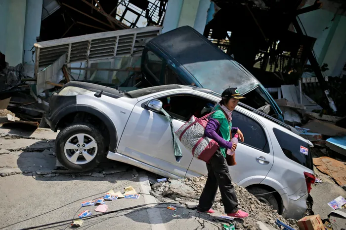 A woman walks past the wreckage of cars which was flattened by earthquake in Balaroa neighbourhood in Palu, Central Sulawesi, Indonesia. Picture: AP Photo/Dita Alangkara A woman walks past the wreckage of cars which was flattened by earthquake in Balaroa neighbourhood in Palu, Central Sulawesi, Indonesia. Picture: AP Photo/Dita Alangkara