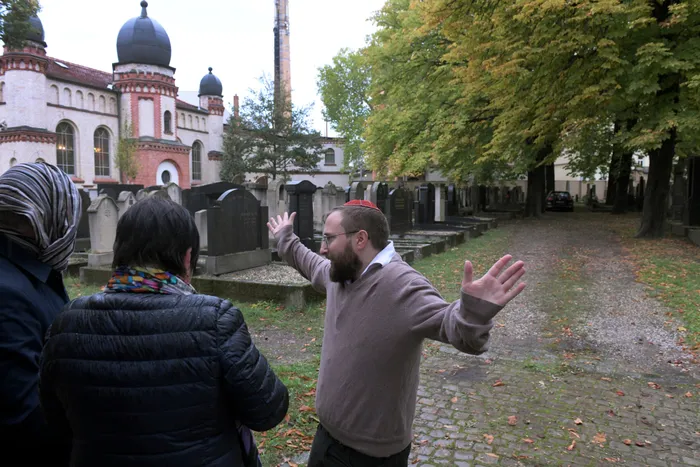 Jeremy Borovitz gestures as he stays in front of a synagogue in Halle, Germany. Picture: AP Photo/Jens Meyer Jeremy Borovitz gestures as he stays in front of a synagogue in Halle, Germany. Picture: AP Photo/Jens Meyer