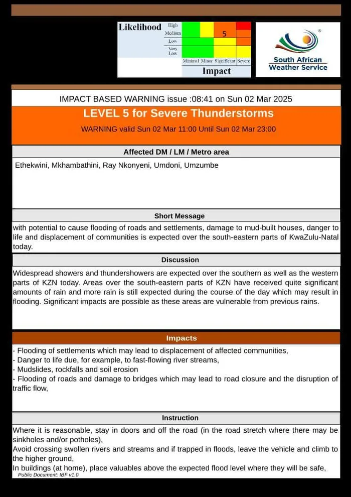 The weather alert from the South African Weather Service has just been upgraded to Level 5 in eThekwini and four other municipalities in KwaZulu-Natal, according to the eThekwini Municipality on its Facebook page.