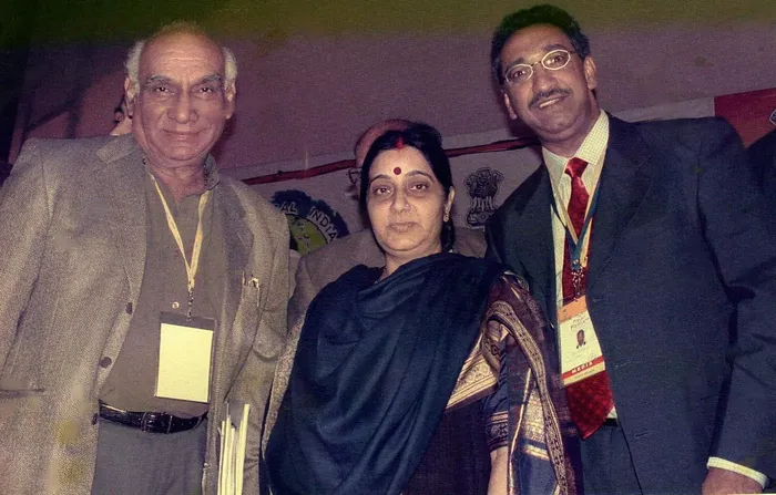 With legendary filmmaker Yash Chopra and India’s Minister of Broadcasting Sushma Swaraj, who are both now late. Hassen delivered a paper at the inaugural Pravasi Bhartiya Divas conference on media in the diaspora in New Delhi in 2003.