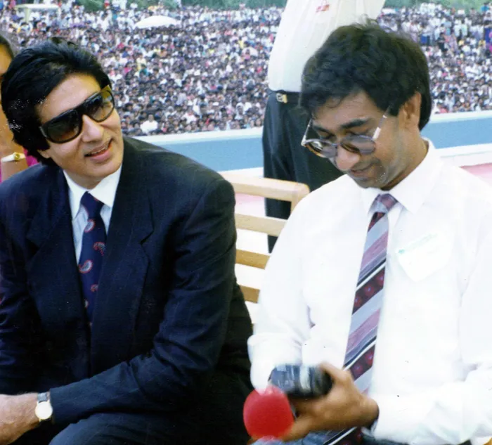 Hassen with the legendary actor Amitabh Bachchan after they landed on the roof of the Chatsworth Centre in a helicopter to address 15 000 fans on the streets.