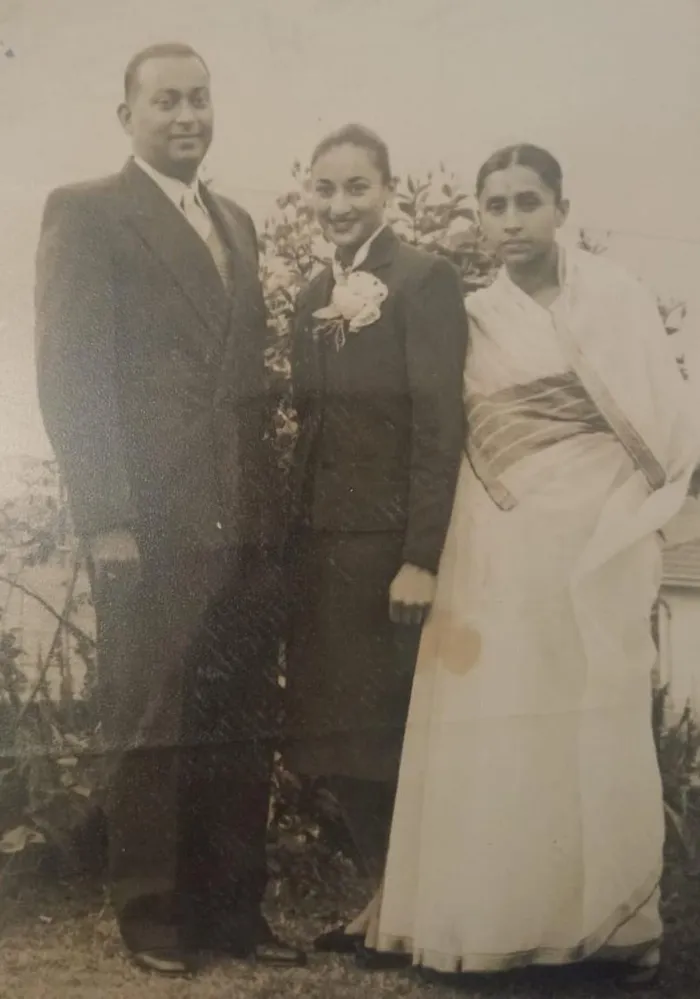 At age 16 with her parents, Mohanpersadh Maharaj and Rookmin.