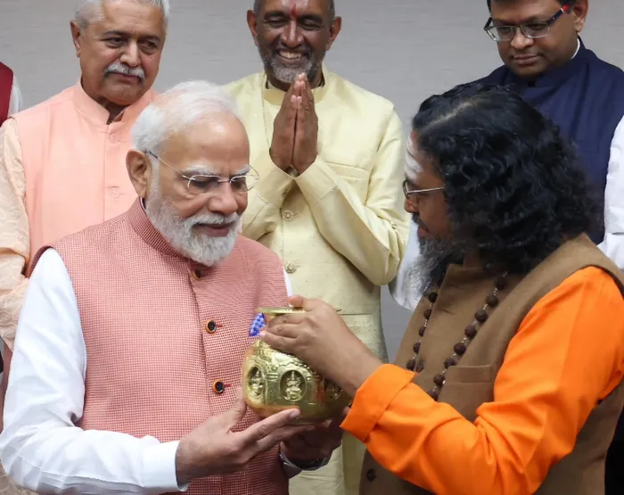 Indian Prime Minister Narendra Modi offers a sacred Kalasha (holy pot) with ‘Shree Anna’ or millets of India and South Africa, to Swami Abhedananda, to be placed at the in Chinmaya Annapoorna.Devi Temple in Durban. As part of the G20 Summit, Modi met with community leaders in Johannesburg, yesterday