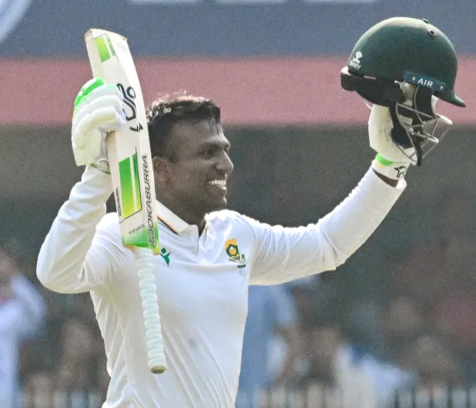 Guwahati: South Africa’s Senuran Muthusamy celebrates after scoring a century during Day 2 of the second Test cricket match between India and South Africa, at ACA Stadium, Barsapara, in Guwahati, on Sunday, November 23, 2025.