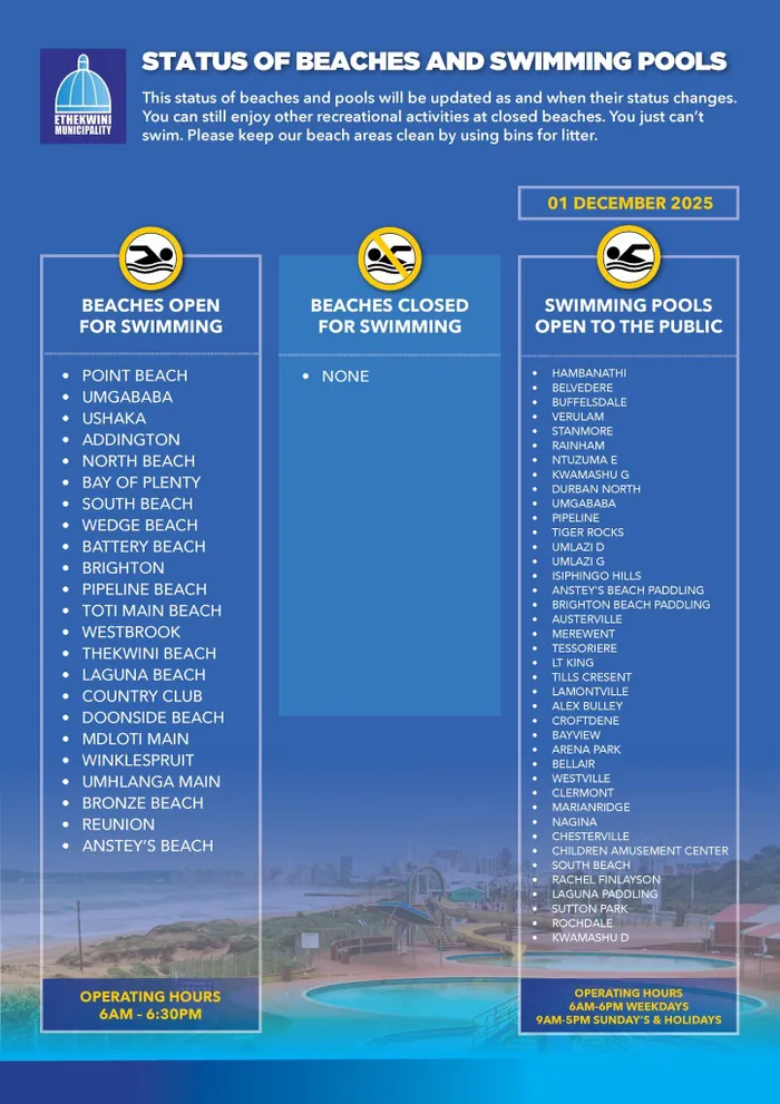The status of the city’s beaches is publicly available on the official website at www.durban.gov.za.