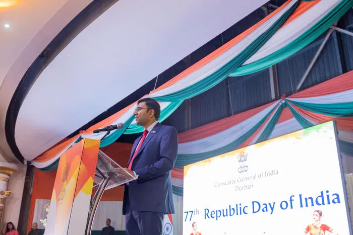 Consulate General of India Niteen Subash Yeola addresses guests during the 77th India Republic Day celebrations held at the Gujarati Hindu Sanskruti Kendra in Durban on Tuesday night.