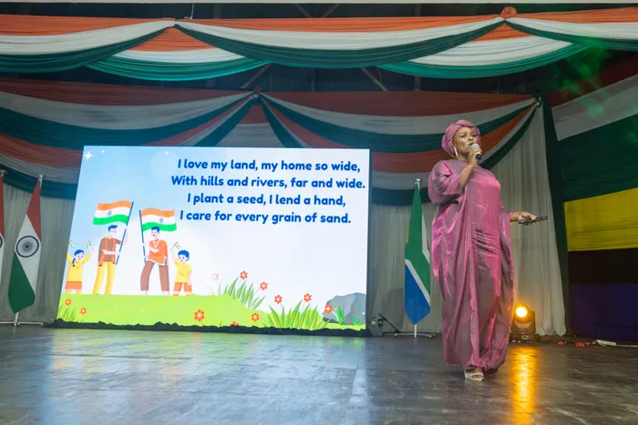 Bongiwe Msomi also known as “Ms. Classic” renders a Peace Song during the 77th Republic Day celebrations held at the Gujarati Hindu Sanskruti Kendra in Durban on Tuesday night.