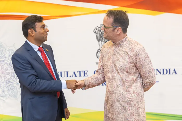 Consulate General of India Niteen Subash Yeola ( left) welcomes Chief Guest KZN MEC for Human Settlements and Infrastructure Martin Meyer to the commemoration of the 77th India Republic Day celebrations held at the Gujarati Hindu Sanskruti Kendra in Durban on Tuesday night.