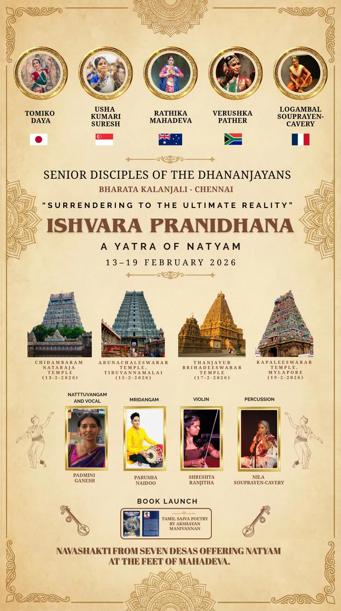 Performances will be held at well known Shiva temples: Chidambaram Nataraja Temple, Arunachaleswarar Temple, Thanjavur Bridhadeeswarar Temple and Kapaleeswarar Temple.