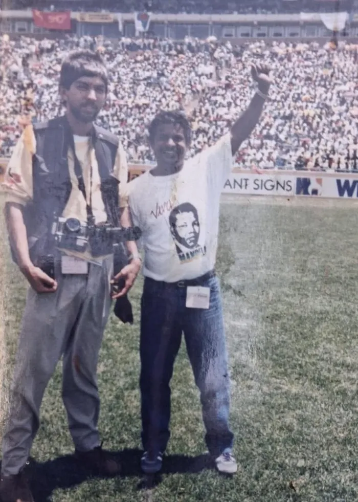 Subramoney, right, while covering the mass rally that the late former South African president Nelson Mandela addressed at after he was released from prison in 1990.