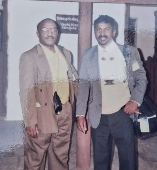 While covering the official visit of Nelson Mandela to India in 1995. He is seen here with a fellow SABC colleague outside the first home of Mahatma Gandhi in Gujarat.
