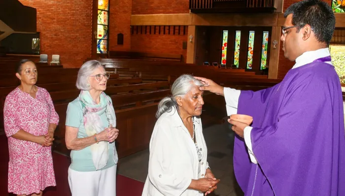 Father Michael Nadaraju, the parish priest of the Parish of St Joseph on Florida Road, places ash on the forehead of parishioner, Maureen Veeriah. Behind her is Maureen André and Therais Duval. Ash is placed on the forehead to mark the beginning of Lent, symbolising repentance, mortality, and humility before God.